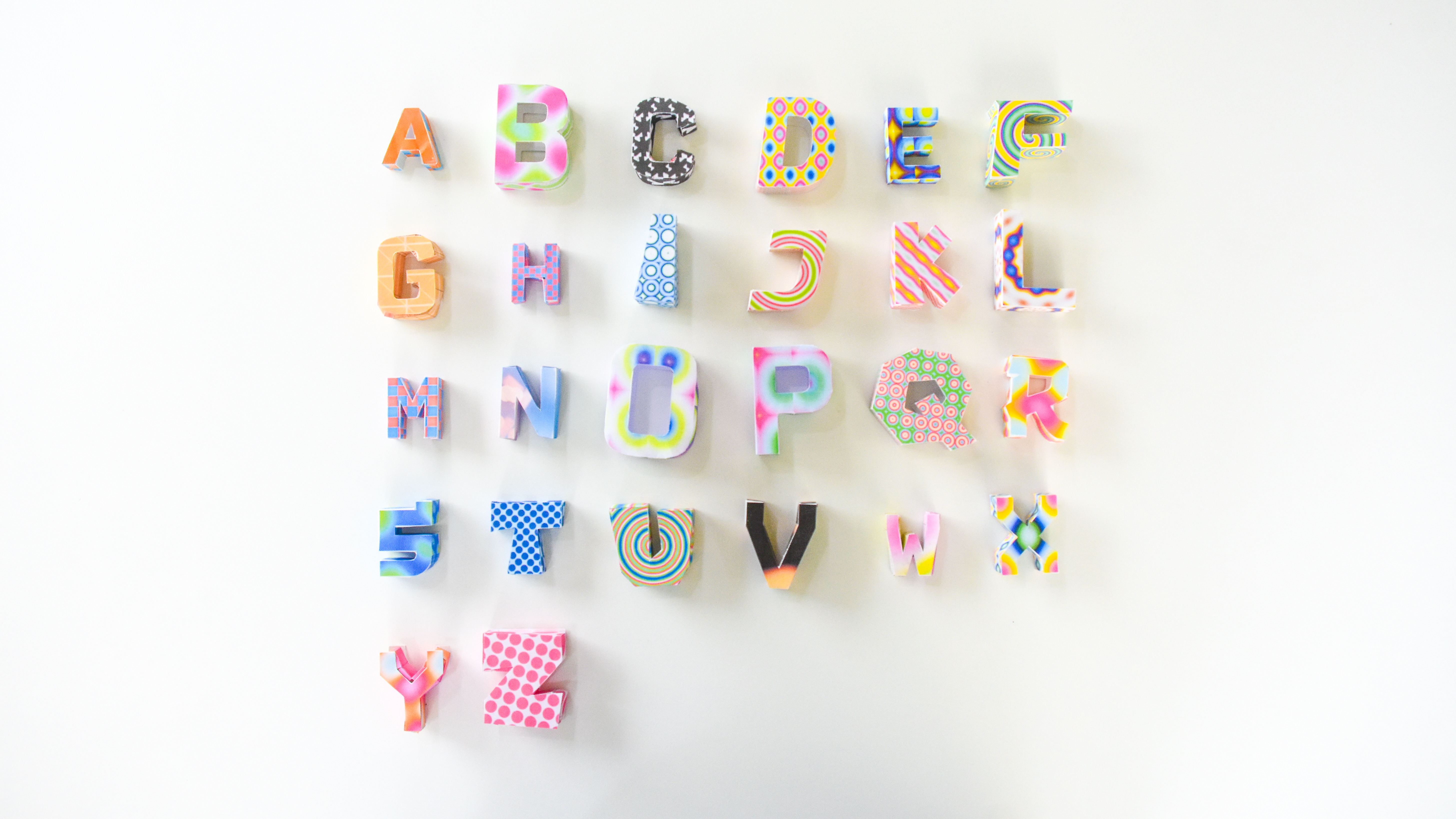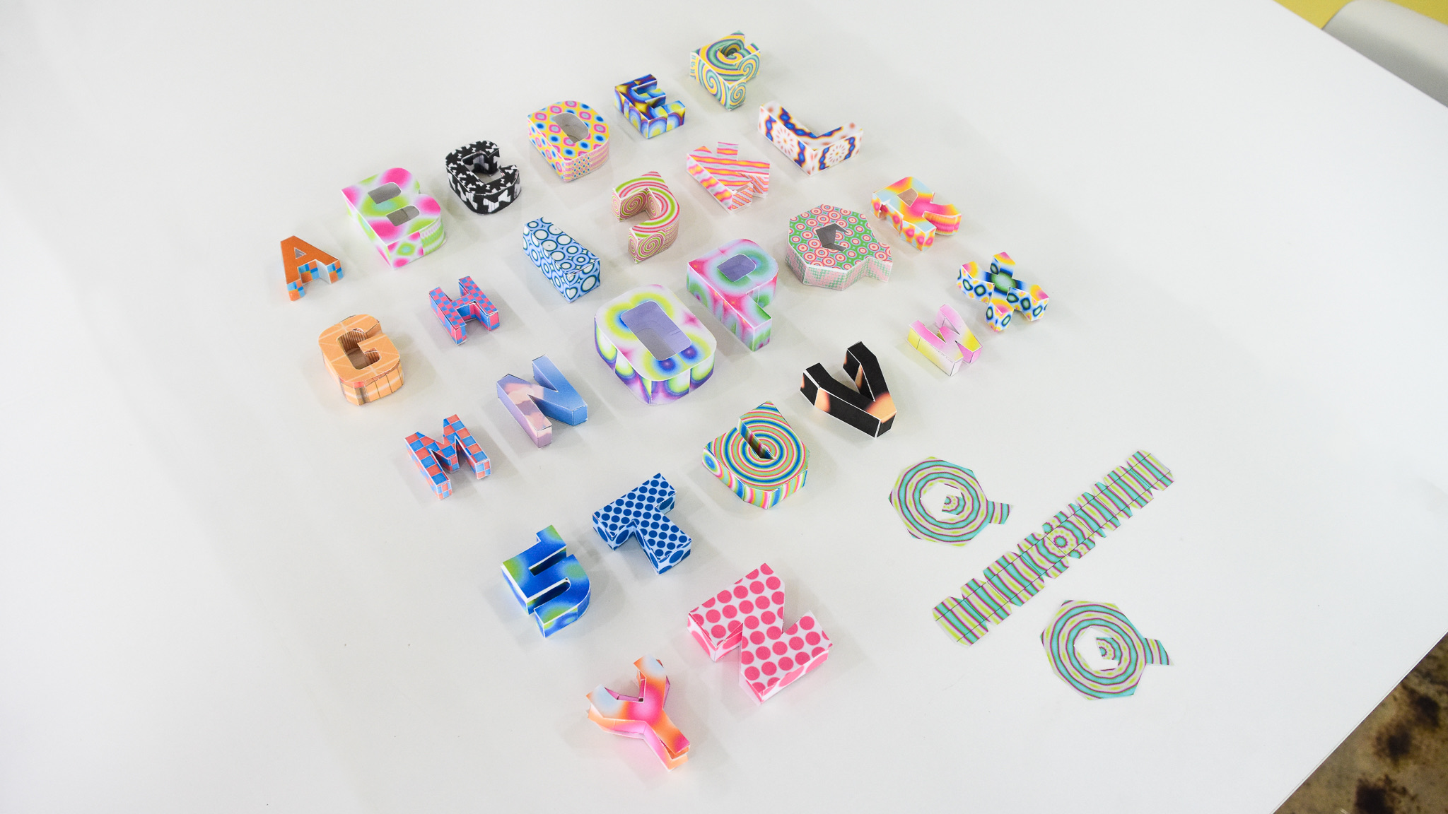 Examples of paper craft outputs created by generating, printing, cutting, folding, and assembling 3D letterforms from A to Z using TypoFold.
