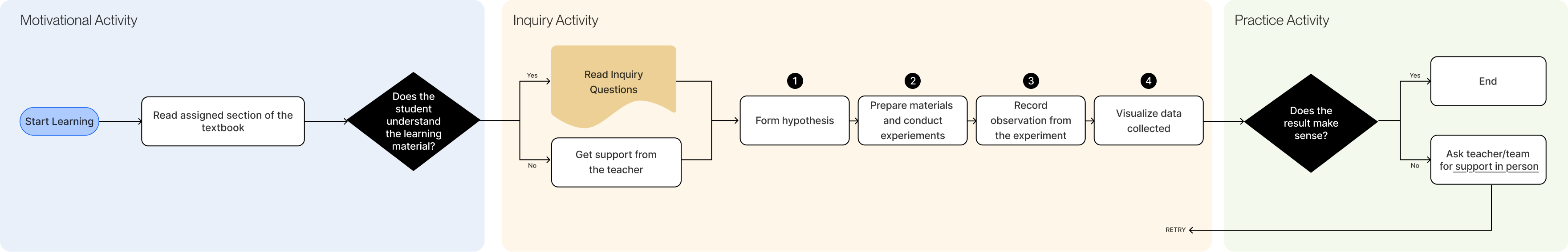 We implemented interaction patterns that operationalize inquiry by allowing learners to change conditions and observe outcomes.