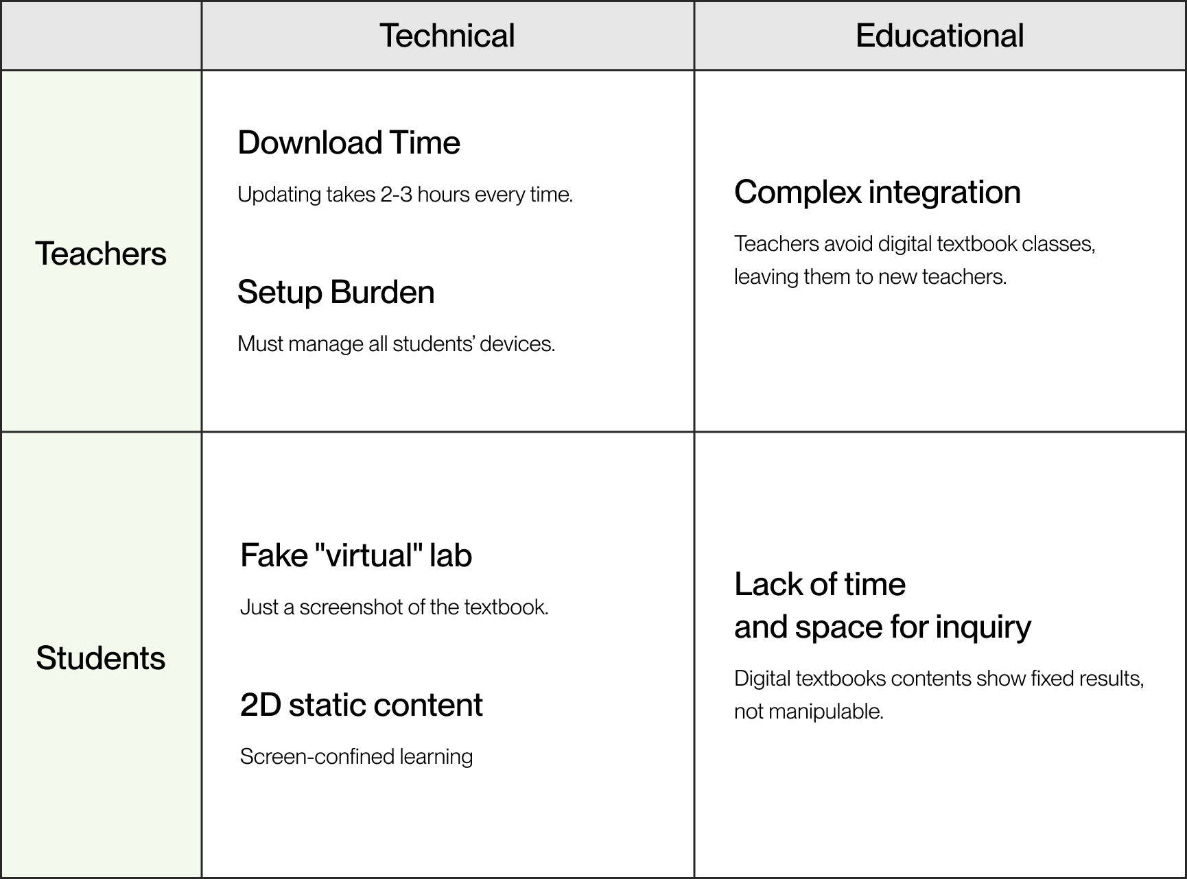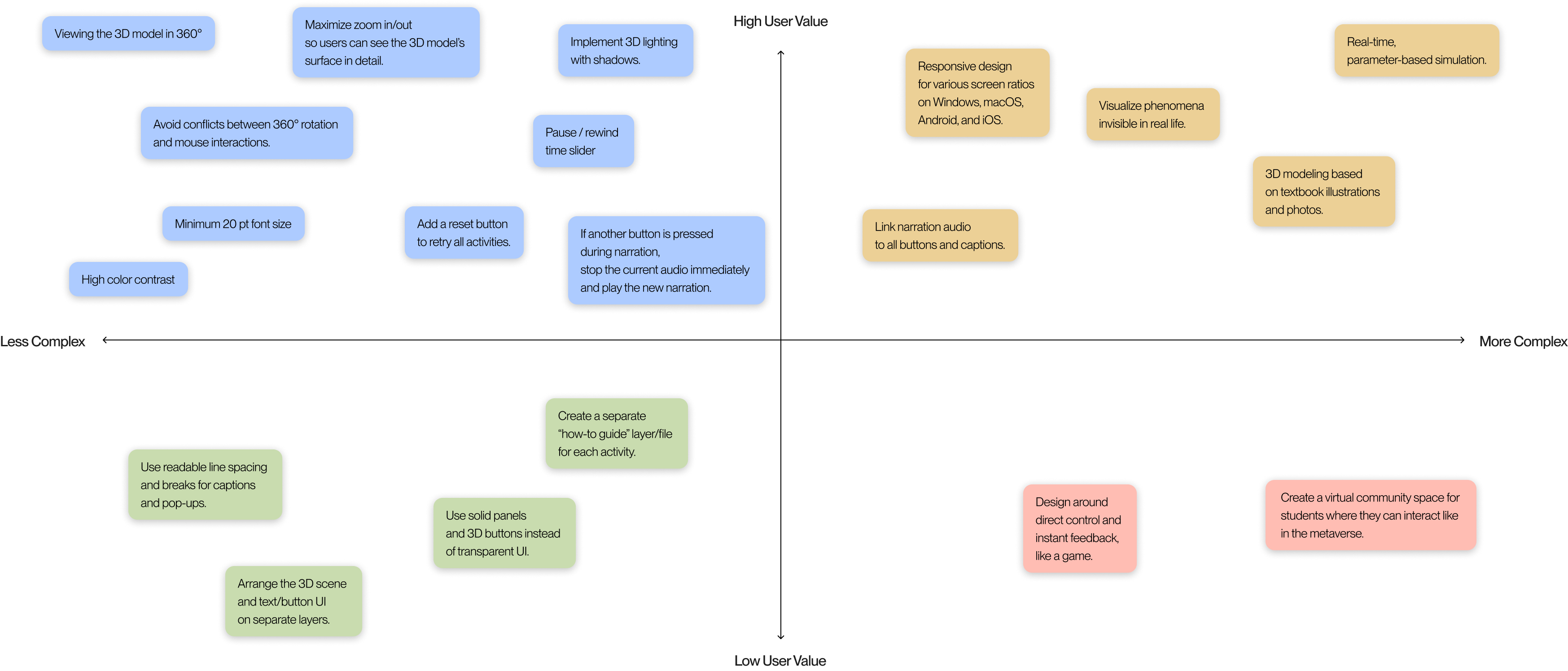 Synthesizing teacher and student pain points with the defined MVP scope led to three design directions that guide how XR should support inquiry, accessibility, and classroom flow.