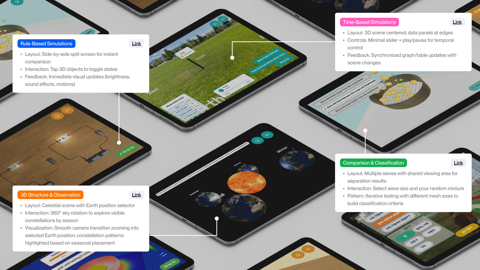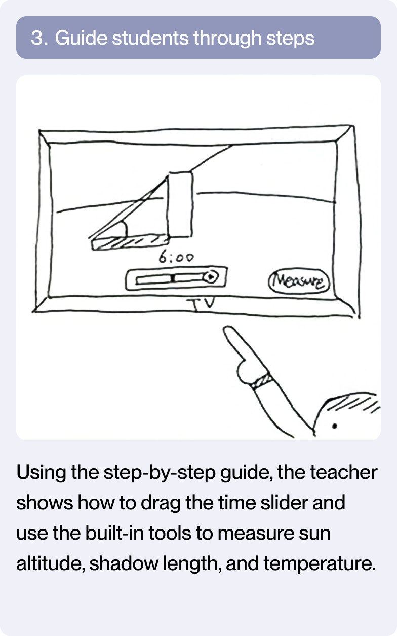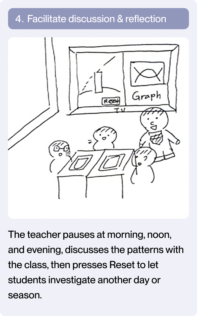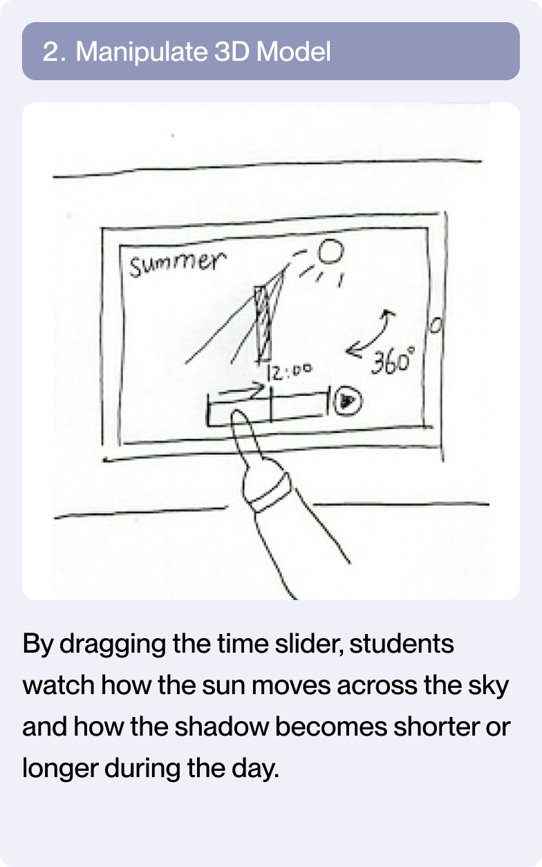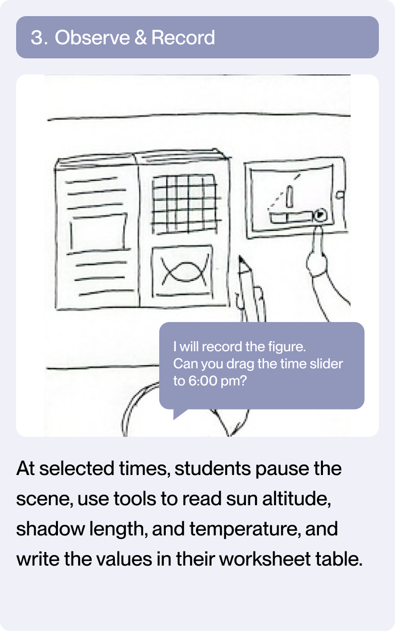 Based on earlier analysis of classroom workflows and inquiry breakdowns in digital textbooks, I designed interaction patterns around recurring inquiry structures found across science units, including time-based change, state comparison, and spatial observation.