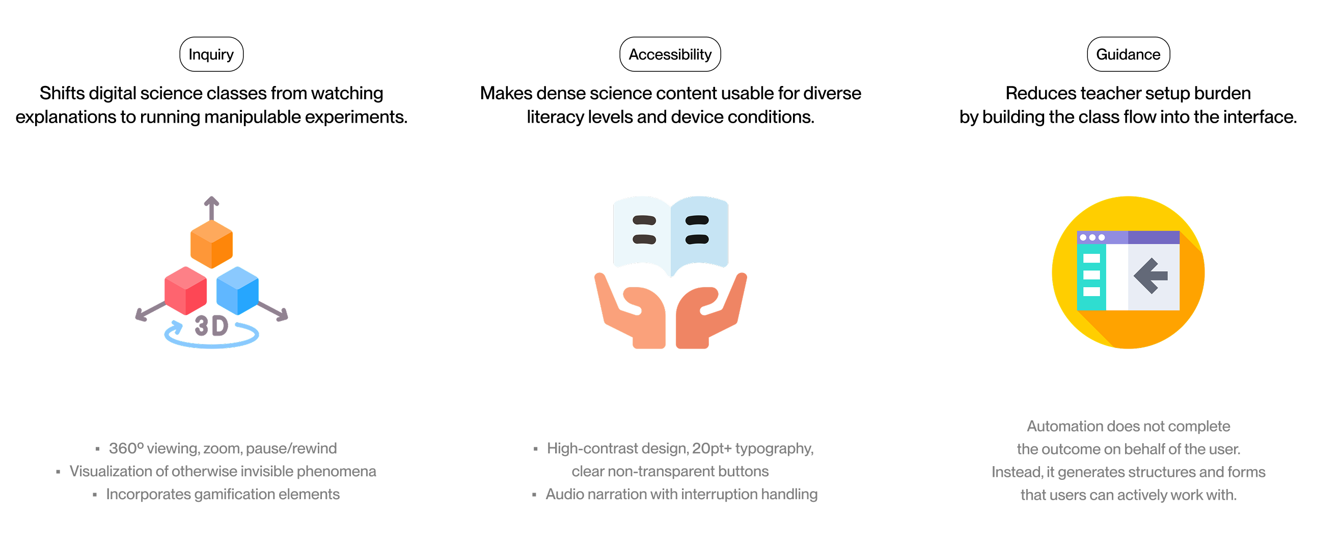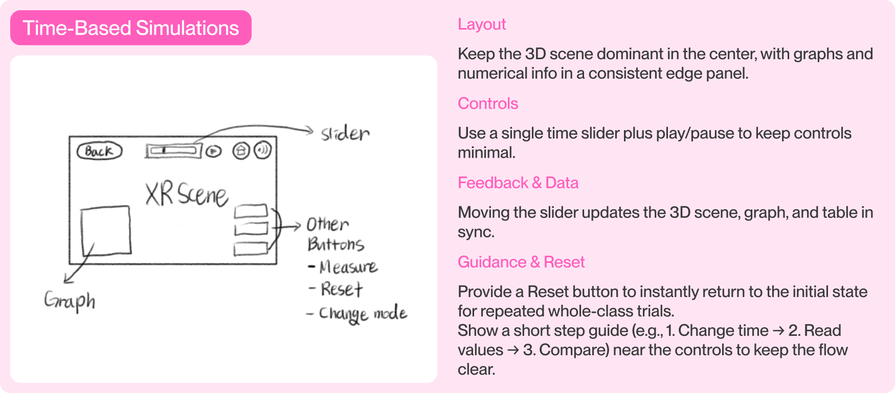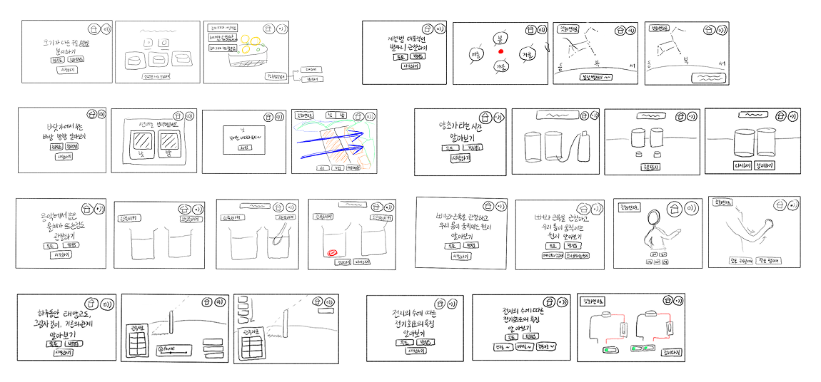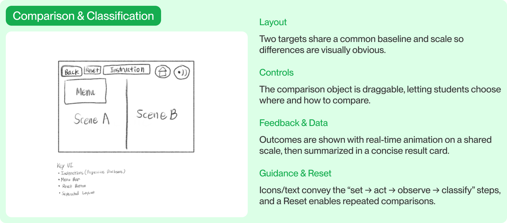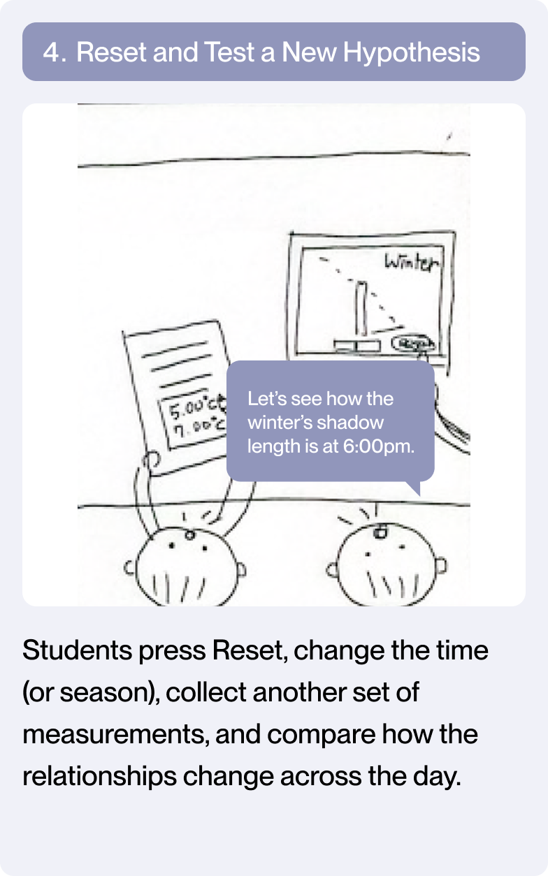 Based on earlier analysis of classroom workflows and inquiry breakdowns in digital textbooks, I designed interaction patterns around recurring inquiry structures found across science units, including time-based change, state comparison, and spatial observation.