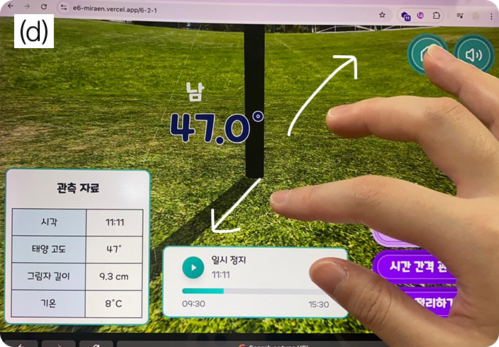 Learners adjust time by tapping or dragging the slider horizontally or vertically, use play and pause to fine-tune moments, zoom to read angular values, and record sun altitude, shadow length, and temperature at fixed intervals.